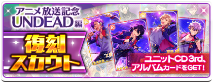 UNDEADのメンバーが過去に★4★5カードで登場したスカウトが復刻スカウトとして期間限定で実行可能となります。さらに、以前復刻スカウトに登場した全メンバーのユニットCD3rdシーズンのCDジャケットイラスト★3カードとユニットCDアルバムシリーズのCDジャケットイラスト★4カードが全復刻スカウトに追加されています。